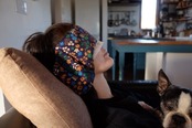 2)電子レンジから出し、専用カバーに本体を入れて軽く中央に小豆を寄せてから、そっと温めたい部分に乗せてご使用ください。