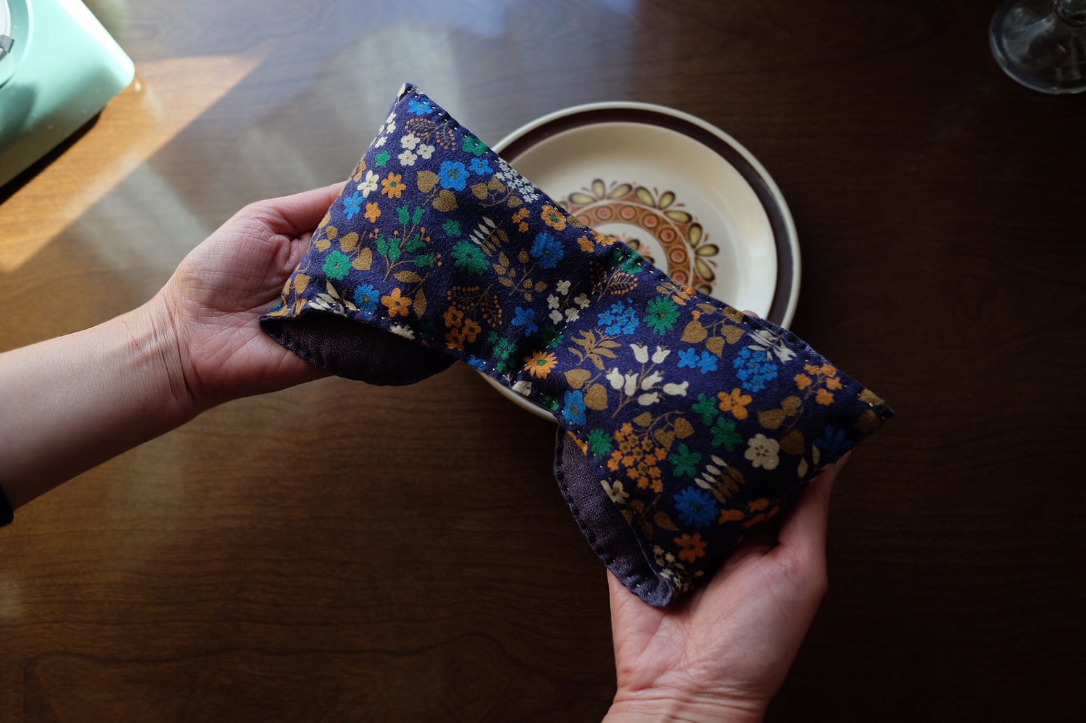 2)電子レンジから出し、専用カバーに本体を入れて軽く中央に小豆を寄せてから、そっと温めたい部分に乗せてご使用ください。