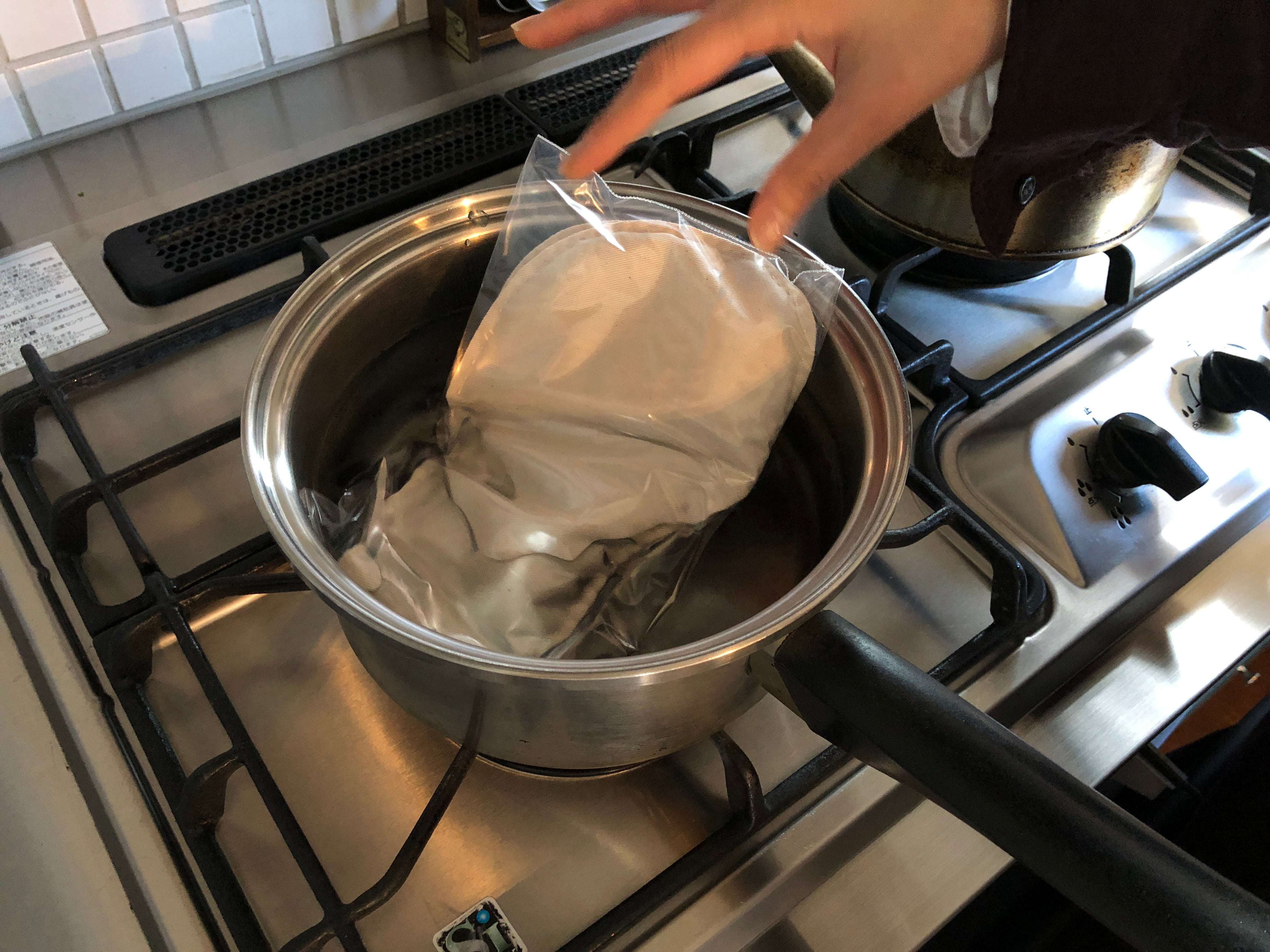 2)本体を折り畳み、ジップロックなど熱に強い密閉袋に収めてしっかりと空気を抜き、ジップの口を閉じます。1)の鍋に入れて、そのまま約10分予熱で温めます。